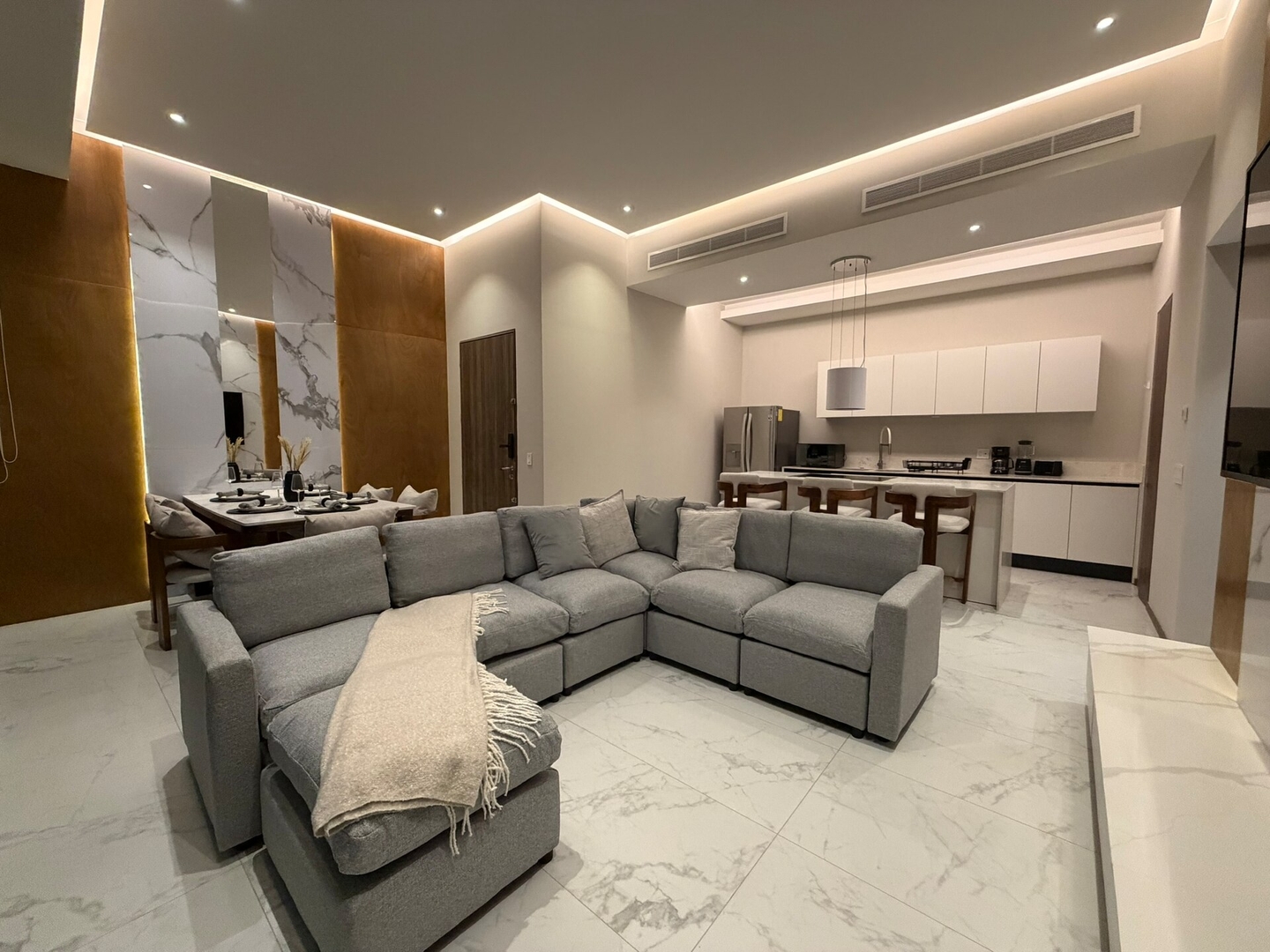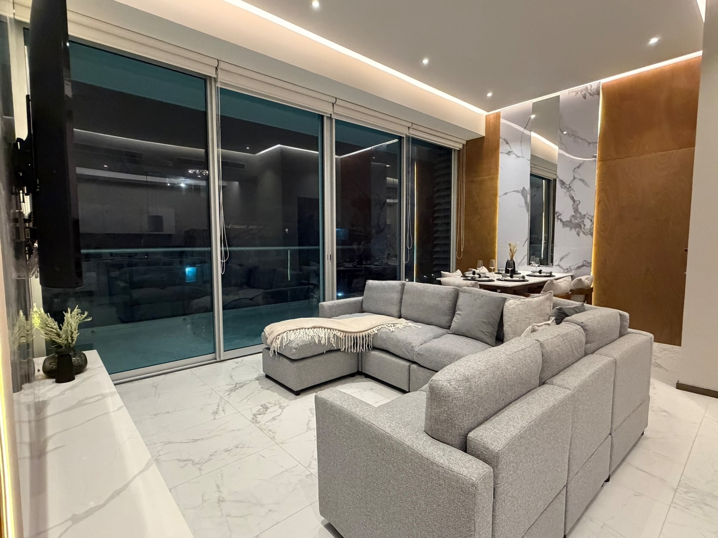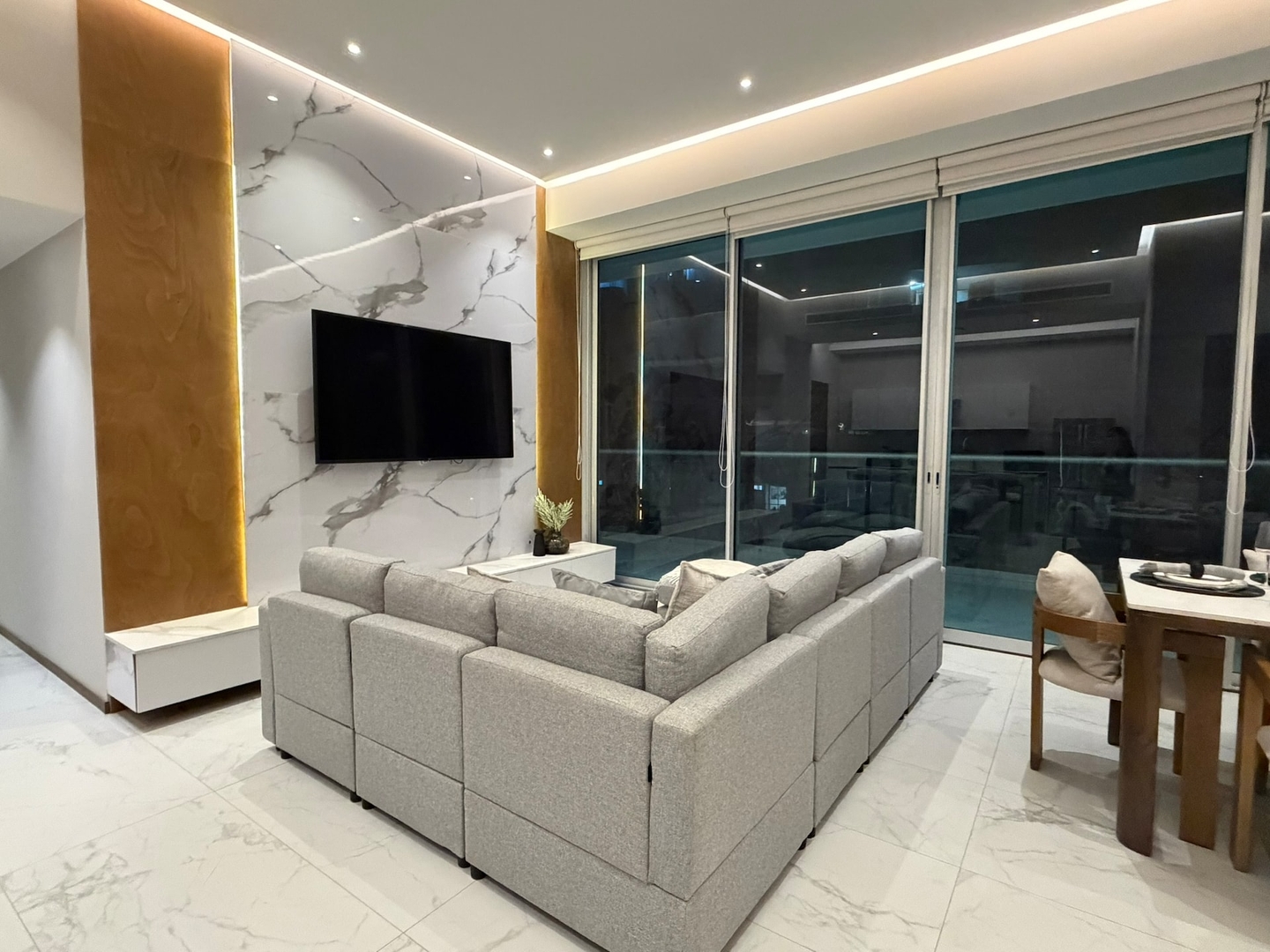 Sala- comedor para 8 personas, con cocina equipada y refrigerador, centro de entretenimiento con televisor SMART TV de 70” y terraza con vista parcial al mar.