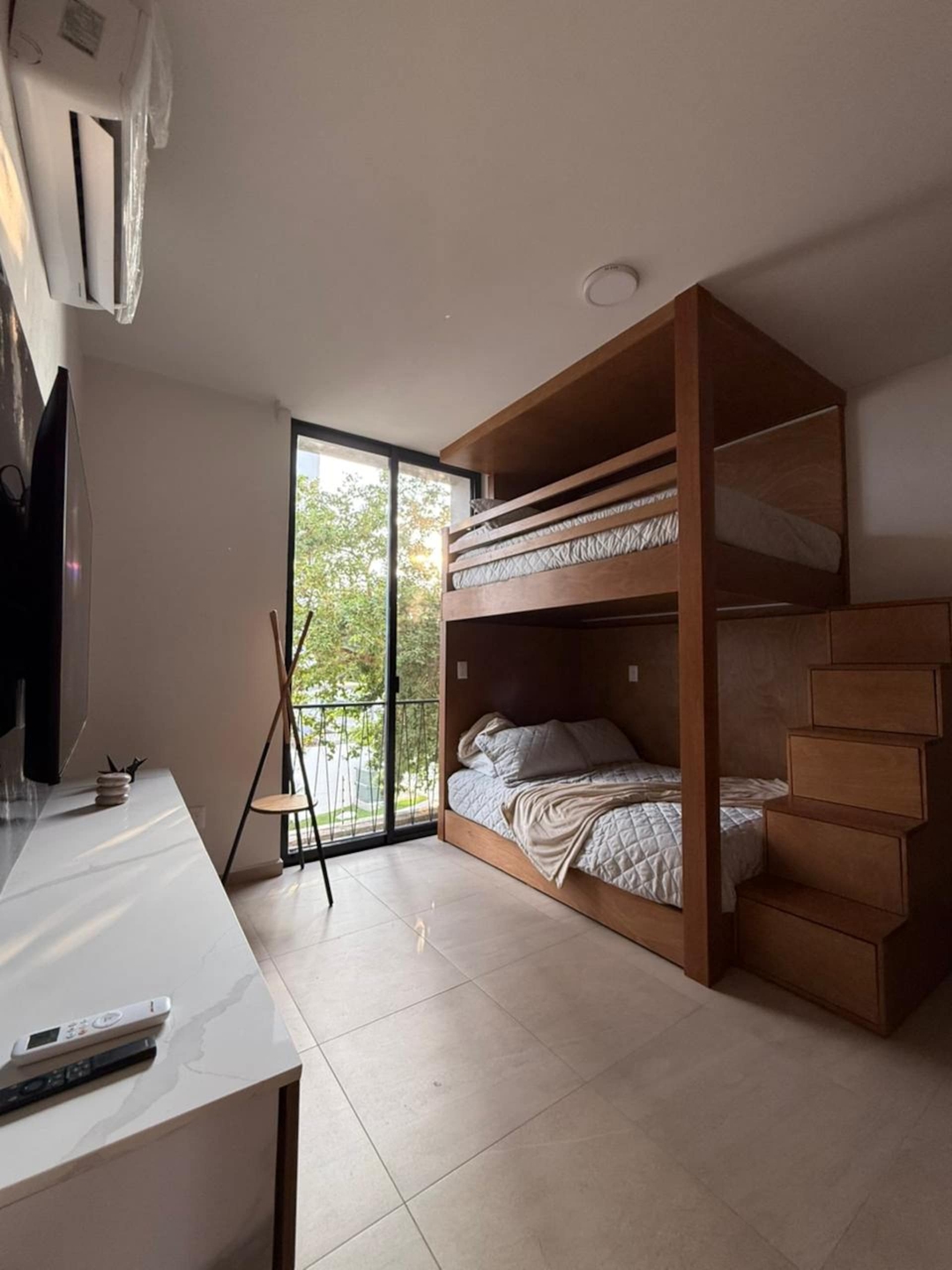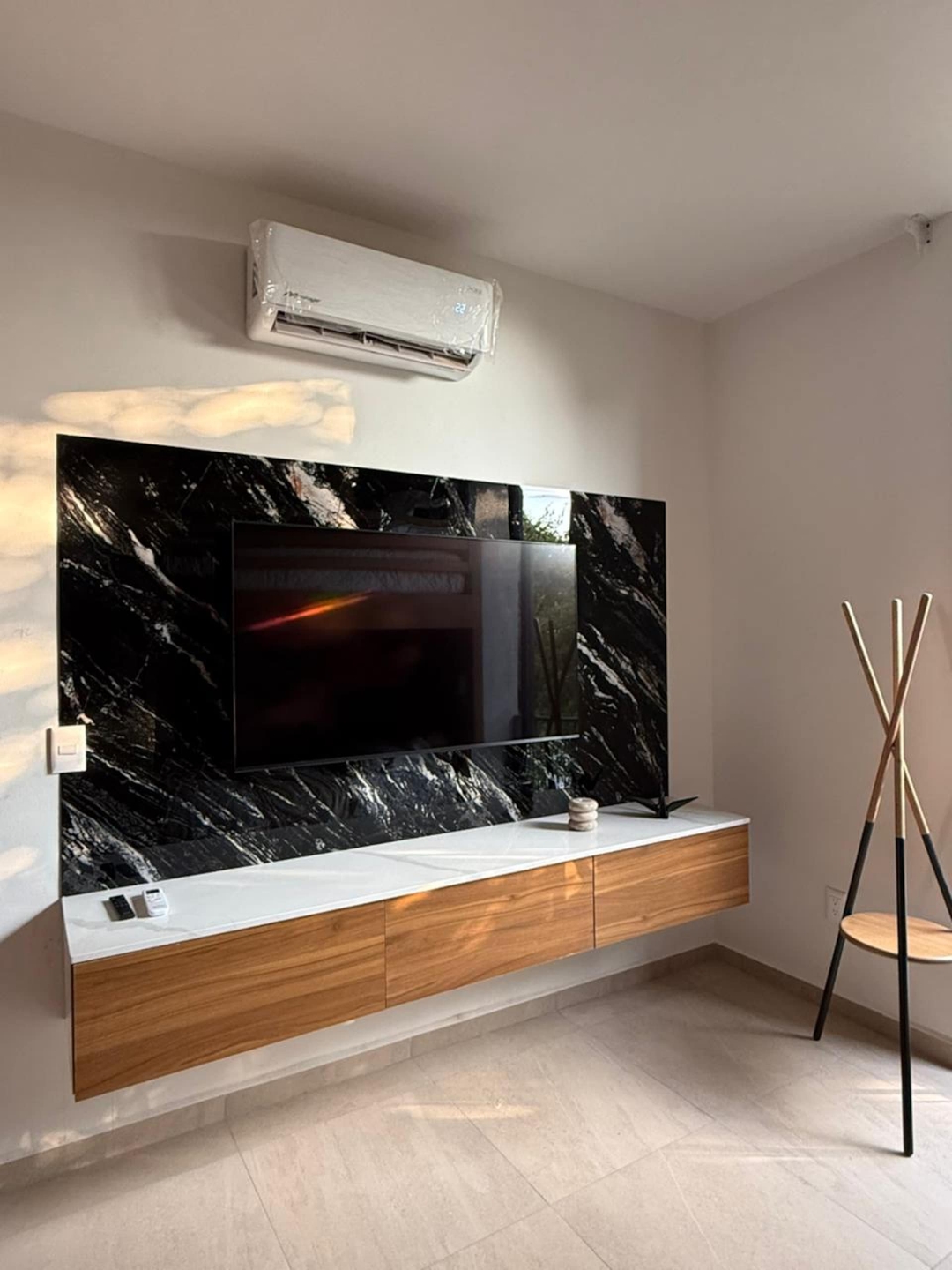 Sala - comedor, cocina equipada y refrigerador, centro de entretenimiento con televisor SMART TV de 75” y terraza con vista a la alberca.